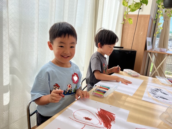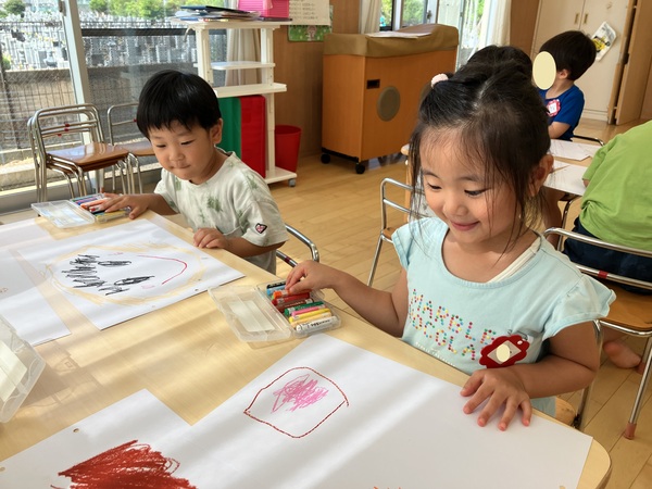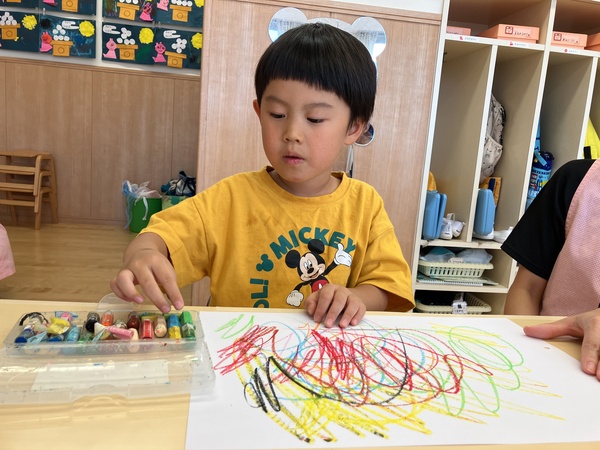 とお友だちと楽しかったことを思い出しながら色を使って描いていました。