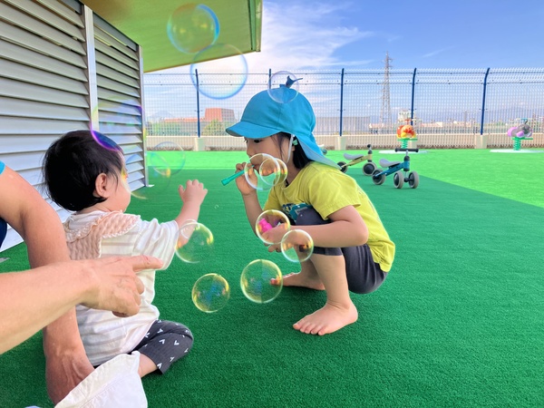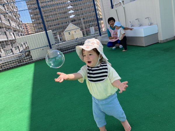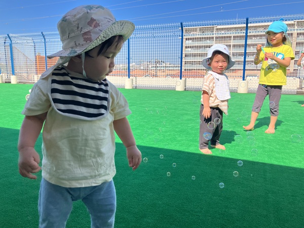キラキラ光るたくさんのシャボン玉を指さしたり、