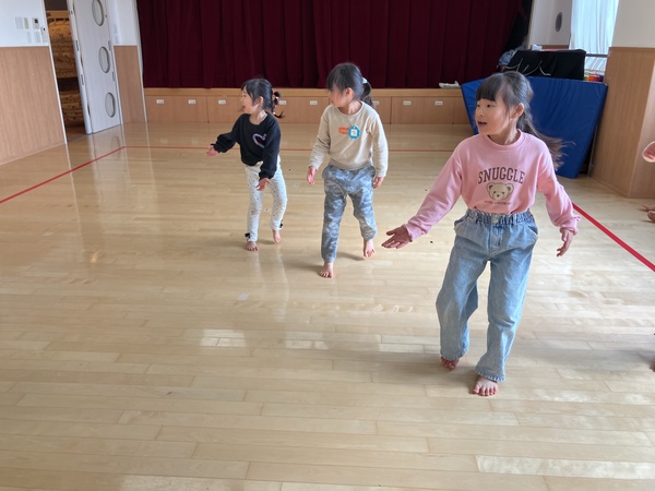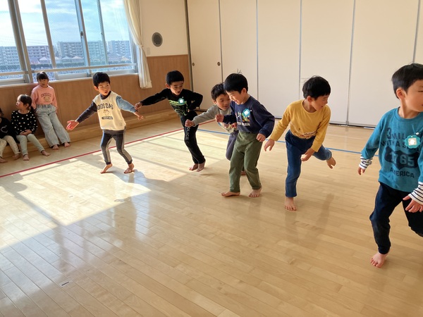 線の上に立ってお集まりに参加する子や保育者の真似をして前に立って踊っている子と