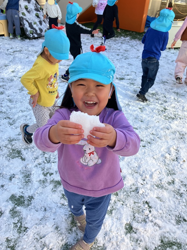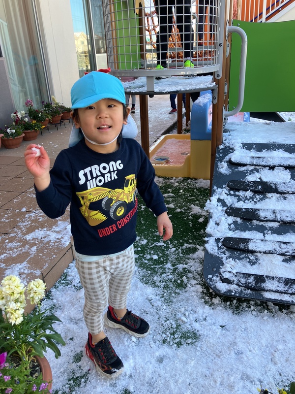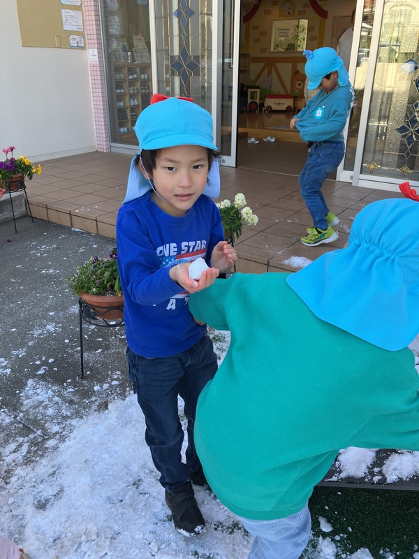 9日(月)4歳児にじ組は、園庭でゆきあそびをしました。