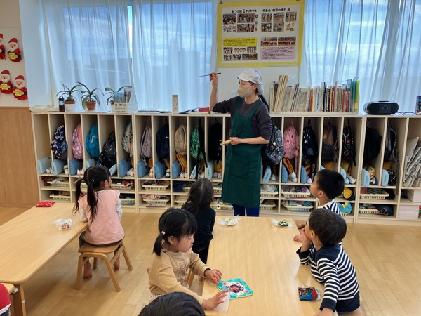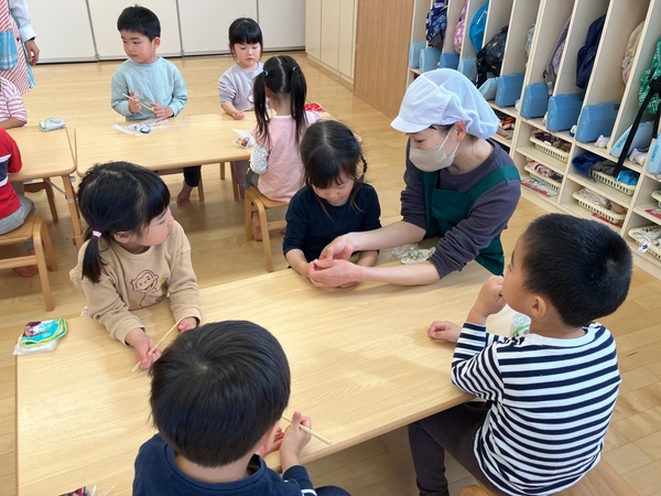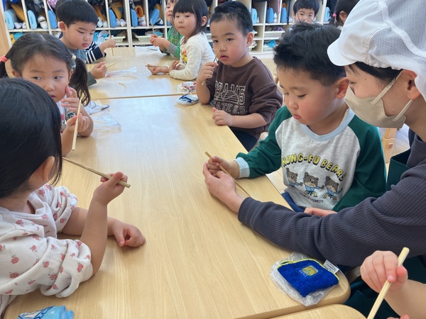 9日〜12日 3歳児つき組は、厨房の先生からお箸指導を受けました。