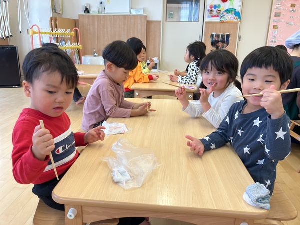 食べることが大好きな子ども達なので早くお箸を上手に使えるようになり、