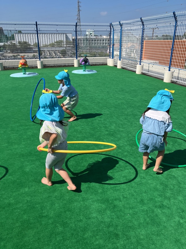 フラフープでは、電車ごっこや転がして遊んでいました。