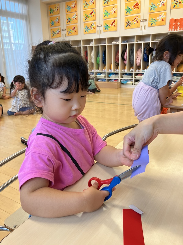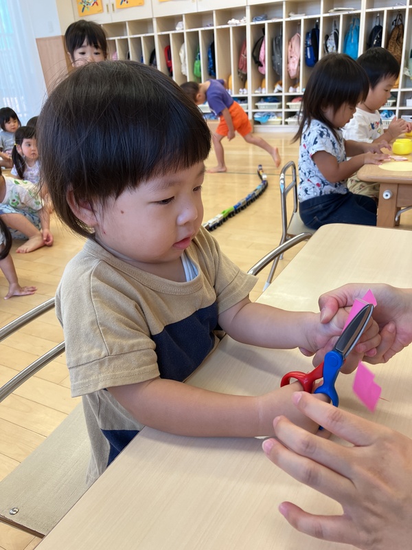 24日(水)2歳児ゆき組は、10月の製作でハサミに挑戦しました。