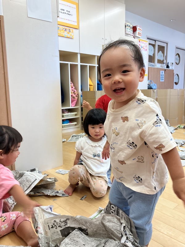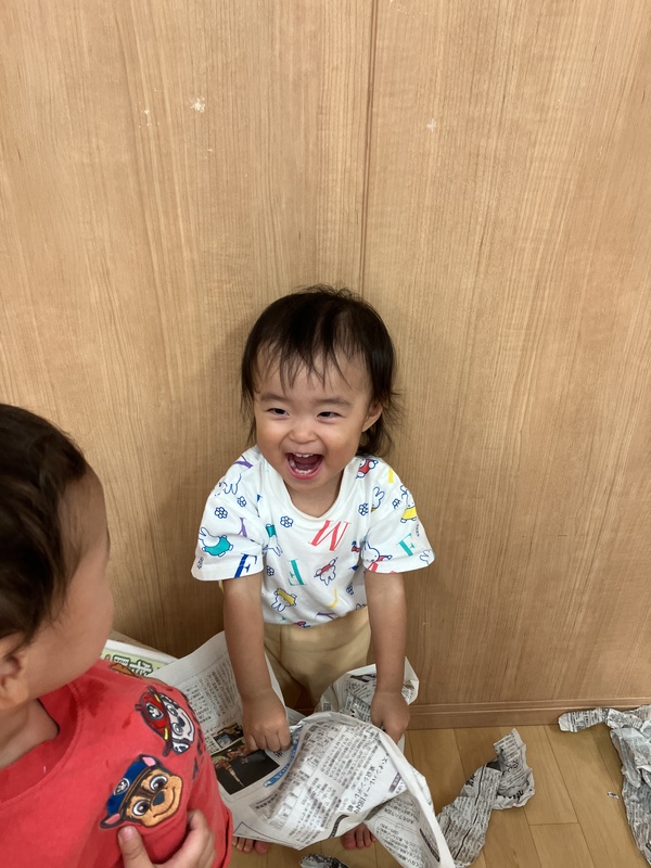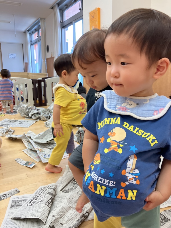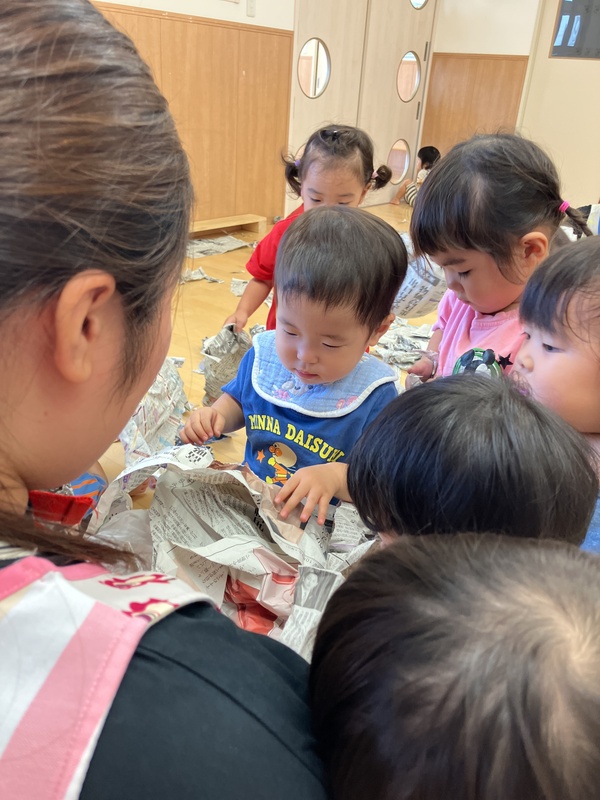 25日(木)1歳児ほし組は、新聞紙あそびをしました。