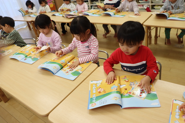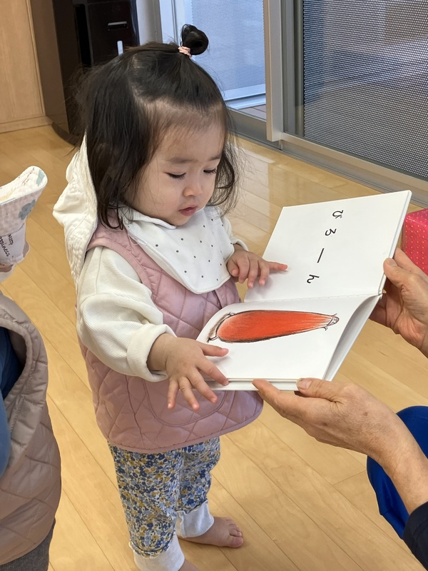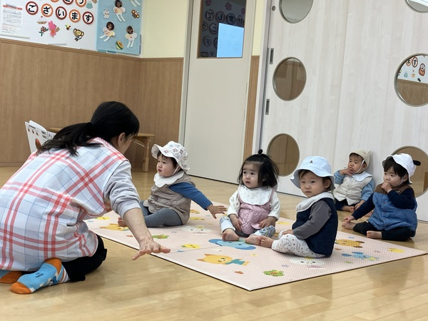0歳児はな組のお散歩前の読み聞かせの様子です。