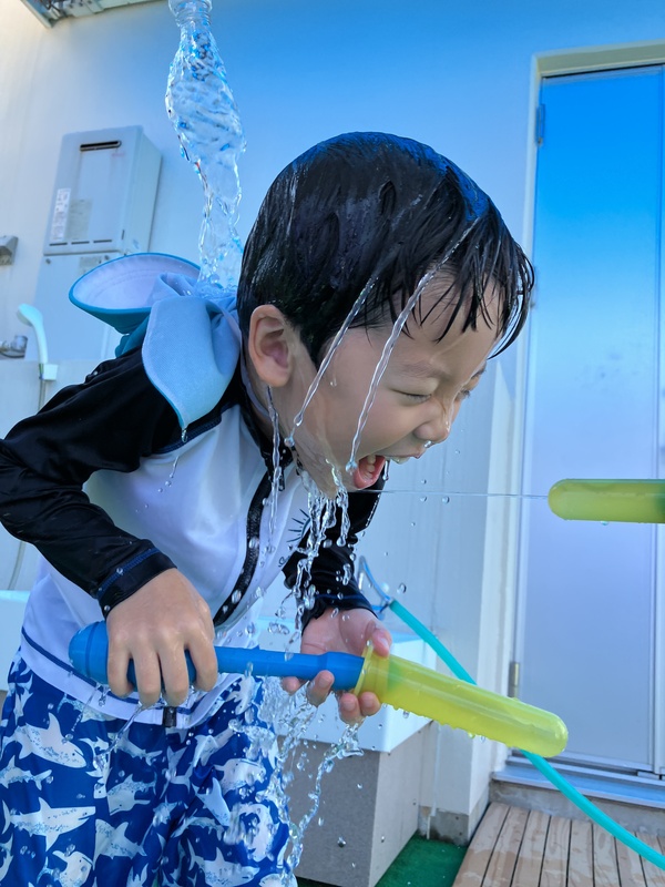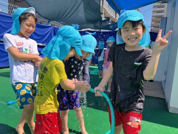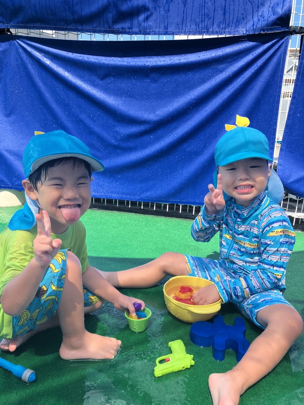 お友だちと笑ったり、水をかけあったりと