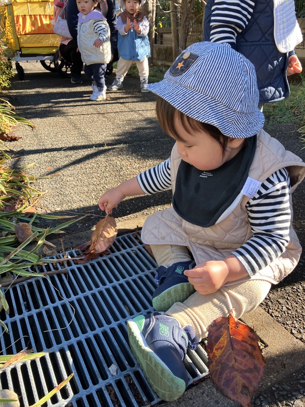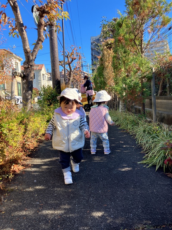 15日(月)0歳児はな組は、園の前の道をお散歩しました。