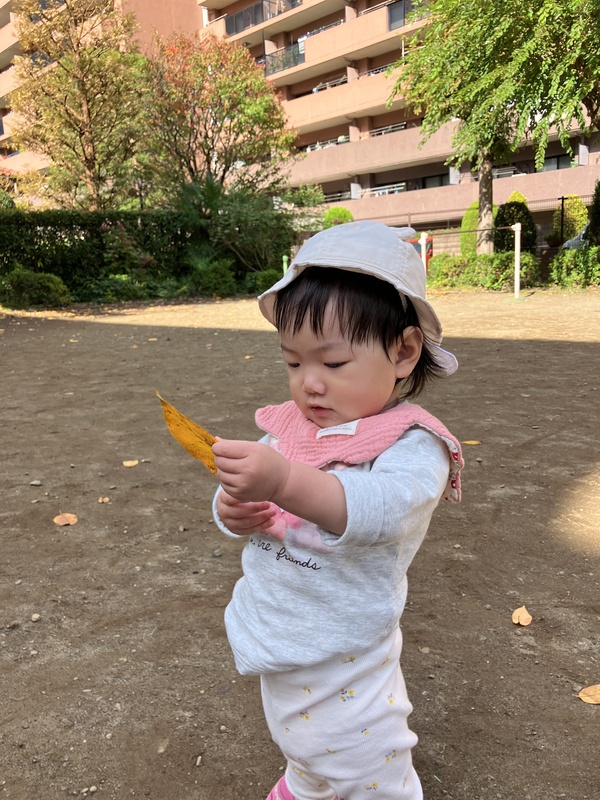 公園内をたくさん歩き、きれいな落ち葉を見つけて