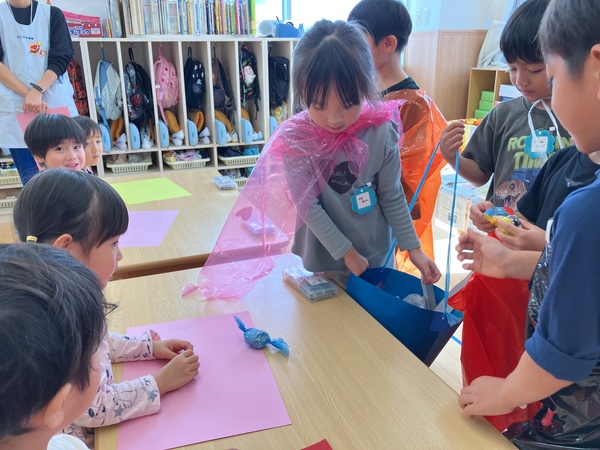 手作りのアメを配ったり、折り紙でかぼちゃを作って