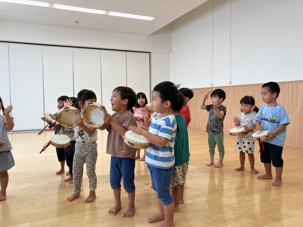 リズムに合わせてタンブリンをたたく、絵カードを使って音符の長さを覚えるなど