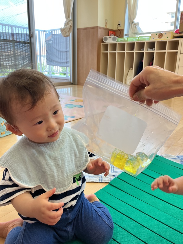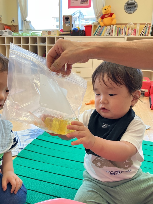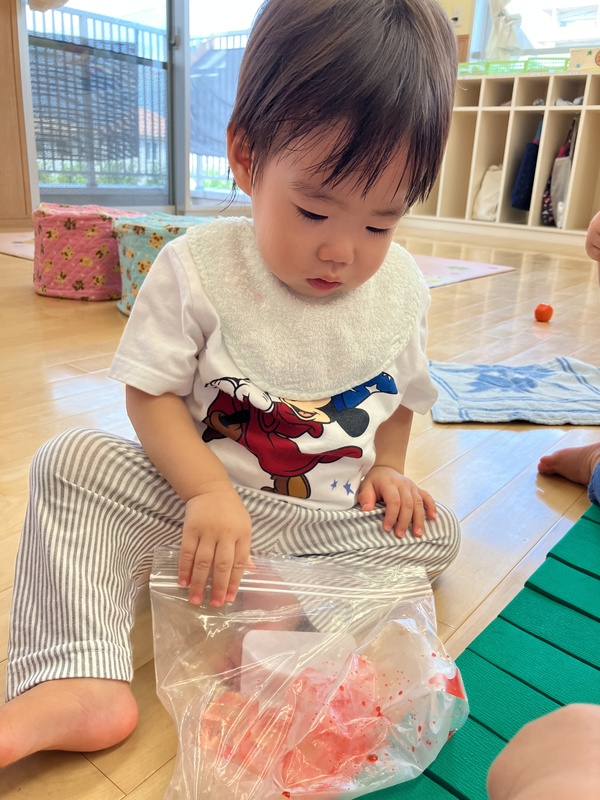 赤・黄・青の色水を袋の上からぎゅーっと触ってハッとした表情をしたり、