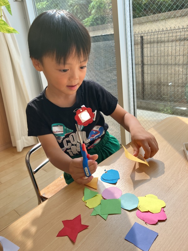 お花、ハート、星と難しい形も集中して、上手にはさみを動かし